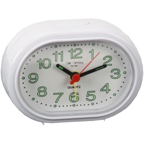 A white oval alarm clock from WILLIAM WIDDOP.